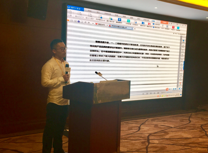 下面我给大家介绍一下甲供石材整体解决方案,它是一个全新B2B的石材解决方案。简单来说是矿山定制,通过全产业链管控提升客户对产品、质量、成本、工期的满意度。大家可以看到,在这个整体解决方案过程当中,首先解决了所有成本问题,我刚才给大家介绍了传统共赢方式当中你们买到的石材其实流通了五六个环节,在这种商业模式下去掉了所有中介环节,矿山直接根据开发商项目需求,工时需求为你的项目定制开采。第二,所有石材都是天然性的,这种方式是根据设计师和开发商提供质量要求和尺寸要求定制开采,这样就大大提升了石材的利用率,这种成本降下来还是要返给开发商的,最重要它是一个标准化定制模式,以前我们特别是大批量石材共赢过程当中,等到项目启动的时候,我们从现货市场解决,如果现货市场突然断货了或者质量标准达不到我们只能被迫降低质量标准或者延长工期。这种方式是根据客户和开发商效果确定,尺寸分解,户型分解,最后是效果确认到最后矿山定制,他是真正严格按照客户的需求定制,所以从质量上来说比传统的供应来说一定会有更好的保障。