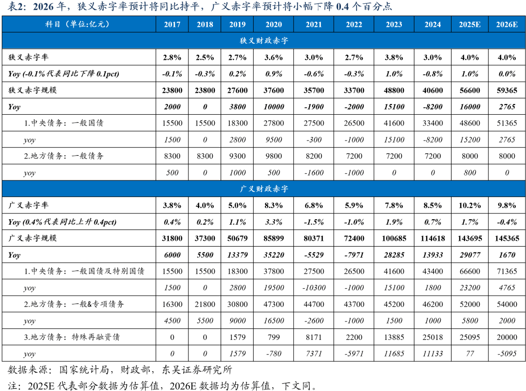 展望2026年,国内财政政策预计仍将保持积极基调,赤字规模与支出强度有望温和提升。从总量视角看,2025年10月,《中央关于制定国民经济和社会发展第十五个五年规划的建议》提出,要发挥积极财政政策作用,增强财政可持续性。2026年,假设赤字率维持在4%;超长期特别国债、新增地方政府专项债务额度分别增长2000亿元;地方政府特殊再融资债发行2万亿元用于置换存量隐性债务,那么据此测算,全国狭义赤字规模预计将达到5.94万亿元,同比增长约2765亿元。全国广义赤字规模预计将达到14.54万亿元,同比增长约1670亿元,广义赤字率约为9.8%,同比小幅下降0.4个百分点,主要由于地方政府特殊再融资债发行缩量,2025年四季度安排用于补充地方财力、支持项目建设的5000亿元特殊再融资债额度预计2026年将不再安排。