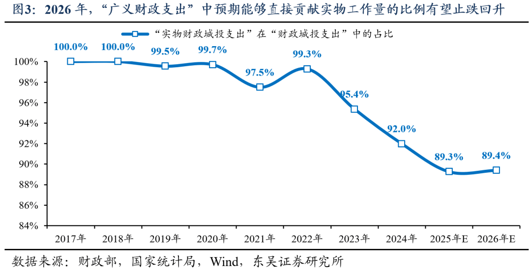 但另一方面,更加重要的是,自2022年至2025年,由于地方债加大在置换隐性债务、偿还拖欠企业账款、补充中小银行资本金、补充政府性基金财力、土地收储、对地方政府投资基金出资等预期难以直接贡献实物工作量领域的投入,同时融资平台债务管理政策持续收紧,因此预计能够直接贡献实物工作量的财政及城投支出(简称“实物广义财政支出”)在广义财政支出中的占比自2022年的99.3%逐年下滑至2025年89.3%。展望2026年,伴随政府性债务管理、土地收储等政策逐步进入“常态化”,“实物广义财政支出”在“广义财政支出”中的占比有望止跌回升至89.4%。