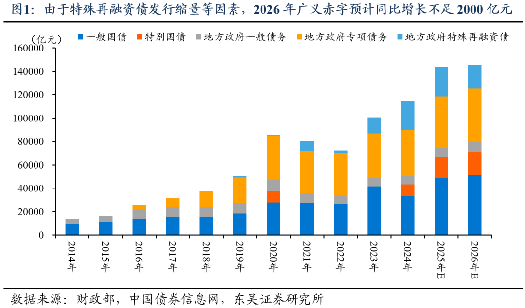 如果在财政支出的基础上,额外考虑地方政府特殊再融资债发行、融资平台(含非发债主体)有息负债增量带来的支出,那么我们预计2026年全国“广义财政支出”有望实现46.56万亿元,同比增长1.9%,该增速低于2026年全国财政支出增速预期约1.3个百分点,主要由于地方政府特殊再融资债或将缩量发行。具体而言,2025Q4地方政府特殊再融资债额外安排2000亿元额度用于支持部分省份投资建设,3000亿元额度用于补充地方政府综合财力(具体用途包括支持地方政府化解存量政府投资项目债务、消化政府拖欠企业账款等),2026年上述5000亿元额度预计将不再安排。